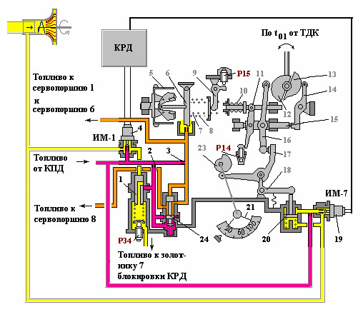 Р14 - винт регулировки максимальной частоты вращения n2; Р15 - винт регулировки частоты вращения n2 на малом газе; Р34 - винт регулировки равновесной скважности S1; 1 - золотник ИМ КРД; 2, 3 - жиклеры; 4 - электромагнитный клапан ИМ регуляторов n1, n2 и t4 КРД; 5 - центробежный датчик частоты вращения; 6 - маятниковый клапан; 7, 8 – пружины; 9 - рычаг; 10 - термокомпенсатор; 11 - рычаг; 12 - кулачок коррекции максимальной частоты вращения п2; 13 - кулачок коррекции частоты вращения малого газа; 14 - рычаг; 15 - шток; 16, 17, 18 - рычаги; 19 - электромагнитный клапан перестройки максимальной частоты вращения n2; 20 - поршень перестройки максимальной частоты вращения n2; 21 – рычаг управления НР; 23 - кулачок заданной частоты вращения; 24 - селектор.
